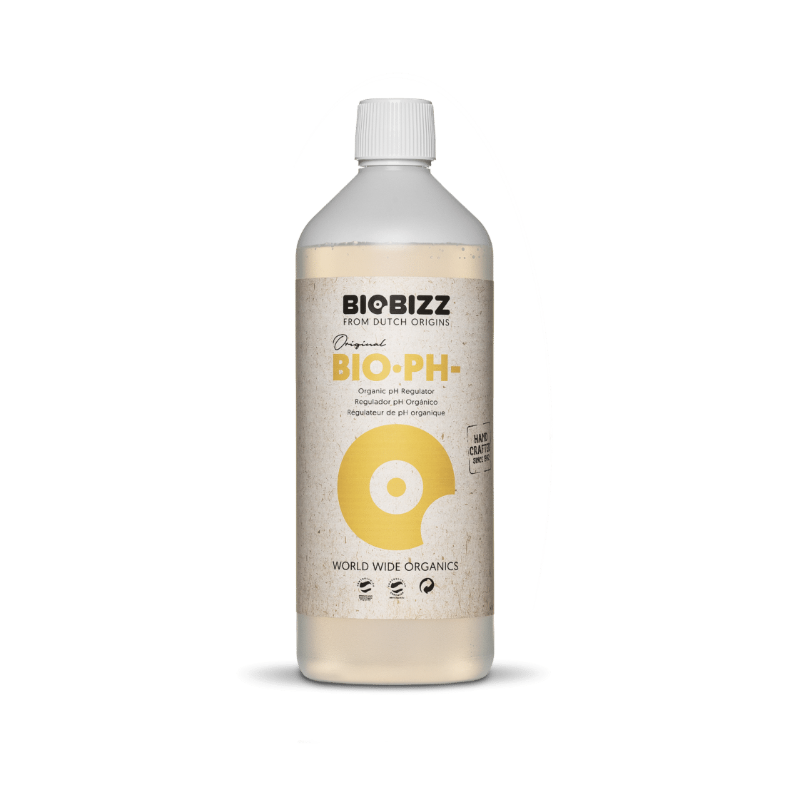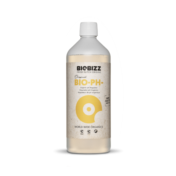 pH – de Biobizz es un producto acuoso, orgánico diseñado para disminuir el valor del pH del cultivo. Su contenido de ácidos cítricos que se encuentra naturalmente en frutas como los limones lo hacen apto para el cultivador orgánico.
