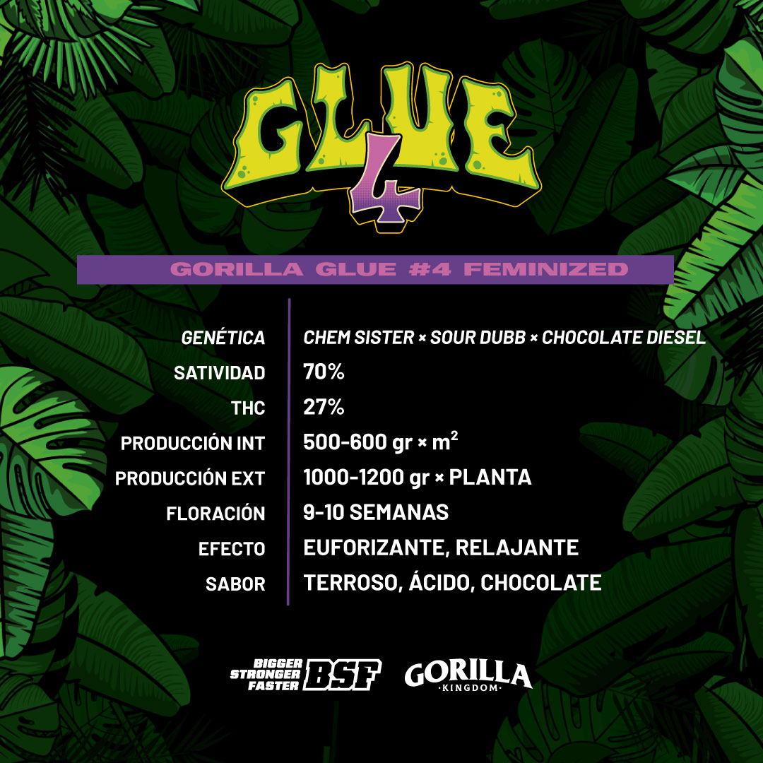 El efecto de Gorilla Glue #4 es igual de impresionante, partiendo con una fuerte sensación de euforia, la que deriva a un estado de profunda relajación que te dejará pegado al sofá; de la misma manera, su placentero sabor terroso y dulce como chocolate, no dejará de sorprenderte. Por su fuerte efecto es totalmente recomendada para problemas de insomnio y estrés.