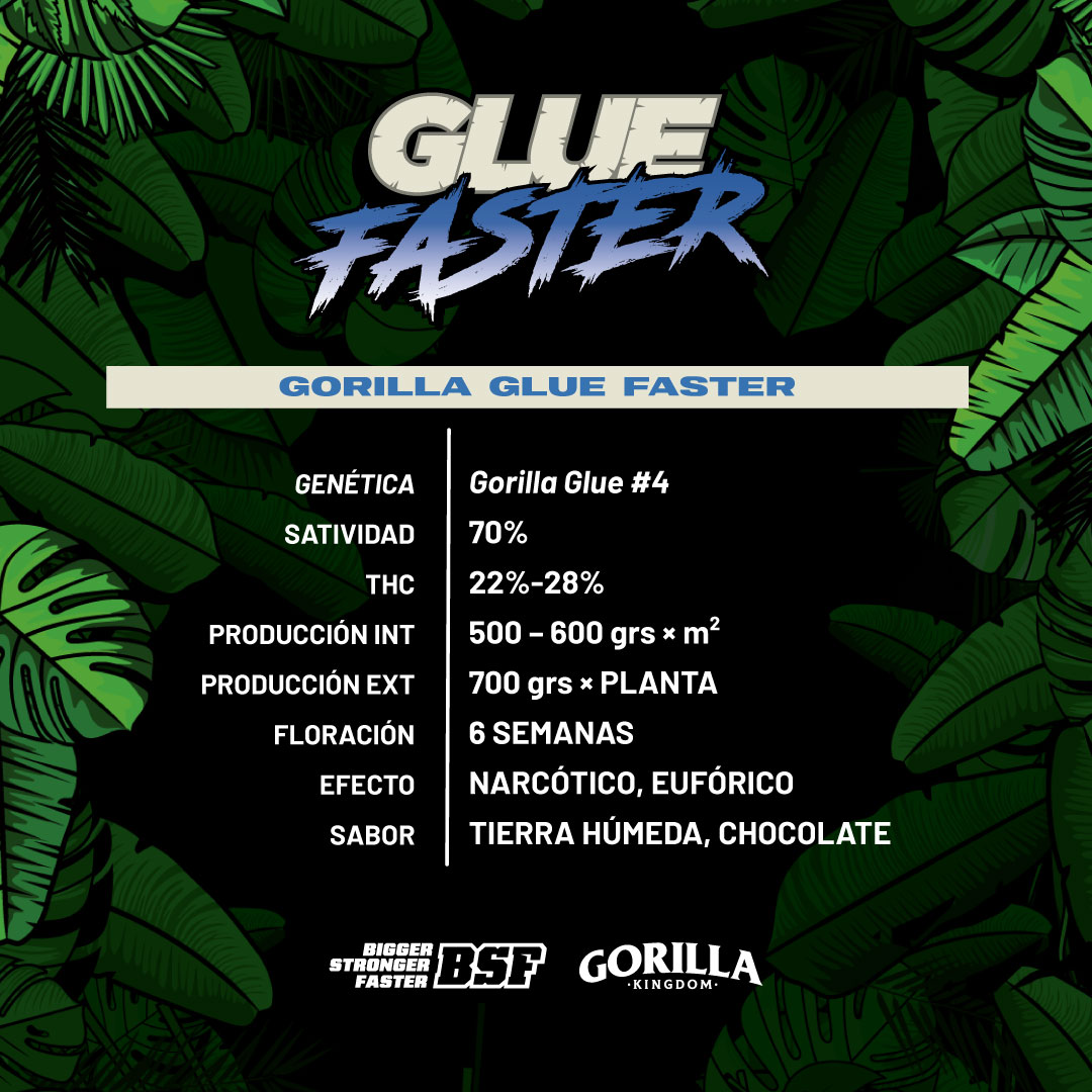 De muy fácil cultivo Gorilla Glue Faster, conserva su característico sabor y olor original además de sus increíbles cualidades físicas y niveles de producción, pero con solo seis semanas de floración.