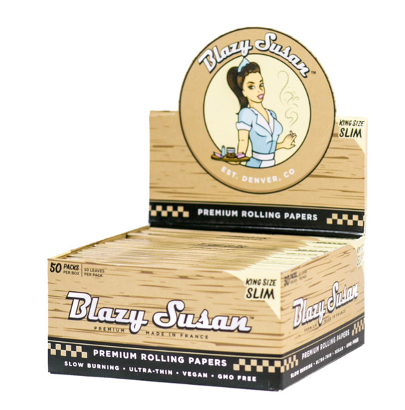 Papelillos sin blanquear de Blazy Susan. El tamaño king slim es ideal para explorar la creatividad al momento de enrolar, especialmente cuando los papelillos convencionales no tienen el tamaño suficiente. Producto vegano.
